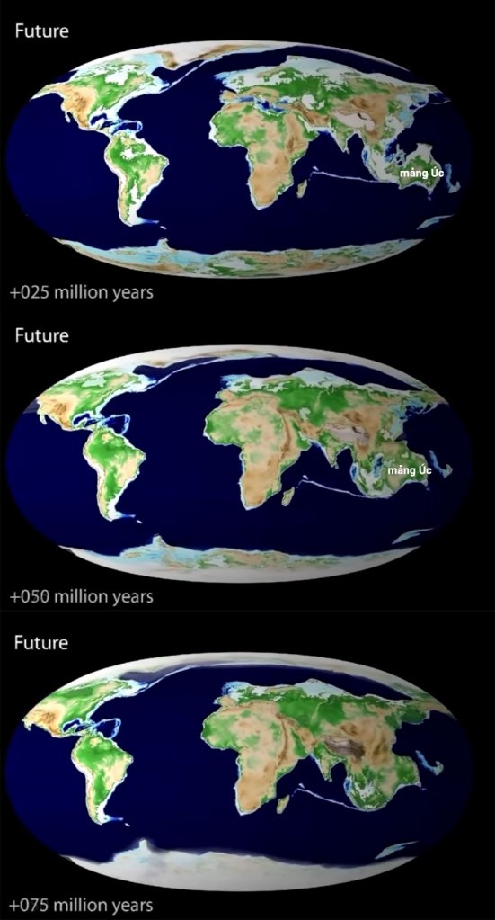 Theo dòng chảy triệu triệu năm, mảng lục địa chưa ngừng nghỉ, vẫn tiếp tục lộ trình liên tục của mình. Mảng Úc điềm tĩnh theo hướng Đông Bắc gom Nhật Bản chạm Hàn sáp nhập vào Trung Quốc và Đông Nam Á, biển Đông thành biển nhỏ không còn là đại dương sau 50 triệu năm nữa. Cây chè sẽ tuyệt chủng, trước đó. Sau 75 triệu năm, toàn bộ bo lại nguyên khối, đất gặp đất, biển Đông biến mất. Việt Nam bé xíu co lại. Khí hậu thay đổi ghê gớm. Sau 225 triệu năm, 1 siêu lục địa khổng lồ hình thành, thời kỳ băng hà khủng khiếp xảy ra khắp nơi. Loài người tuyệt chủng.
