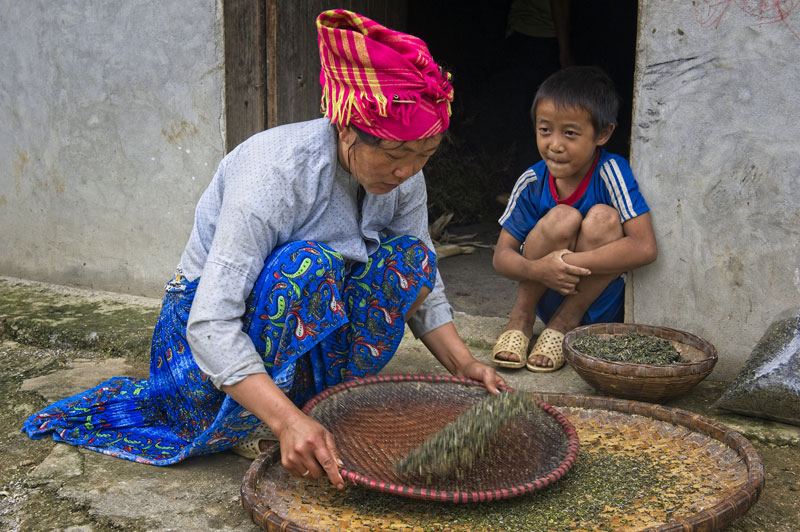 Chị tiếp tục công việc của mình, tôi cùng bạn mình trao đổi công việc, chụp ảnh cũng như hỏi thêm một số thông tin. Trời đã quá trưa lúc lâu, mải mốt mới để ý thấy bụng đói, tôi đề nghị xuống chợ mua thức ăn về đãi cả nhà. Giữa chợ đi một vòng không có gì cả, họ đi nghỉ trưa hết rồi, hẹn tối nhé, có đồ cất đi rồi hỏi bán không chịu luôn, nghĩ thấy hậm hực thật. Lòng vòng qua lại may quá chúng tôi mua được ít đậu phụ và thịt lợn, hẻo hơn kỳ vọng bữa trưa thịnh soạn no say, nhưng có còn hơn không. Tôi và anh Mông nhanh chóng ra về kẻo mọi người đợi lâu. Lần này, xe vẫn xóc lắm, được cái mình tôi, cái yên xe dài hơn hẳn, đỡ nỗi khổ bấu víu. Tới nhà, anh Pó nhanh tay sửa soạn rán đậu, rang thịt, hái thêm ít cải mèo luộc chấm mắm. Cơm xong xuôi, chúng tôi nán đợi cho xong mẻ trà chị sao rồi mới ăn. Mẻ sao khô đánh mốc kéo dài hơn 1,5 tiếng cuối cùng cũng hoàn thành, chúng tôi háo hức ngồi vào bàn ăn nâng ly rượu mừng thành công rực rỡ ngày hôm ấy. Tiếng đũa, tiếng thìa leng keng, ly nâng ly chạm cạch cạch hòa cùng tiếng cười nói vang nhà. Bữa ăn luôn là niềm vui lớn, phần thưởng sau những giây phút giao lưu, tìm tòi mỗi ngày mới mẻ.