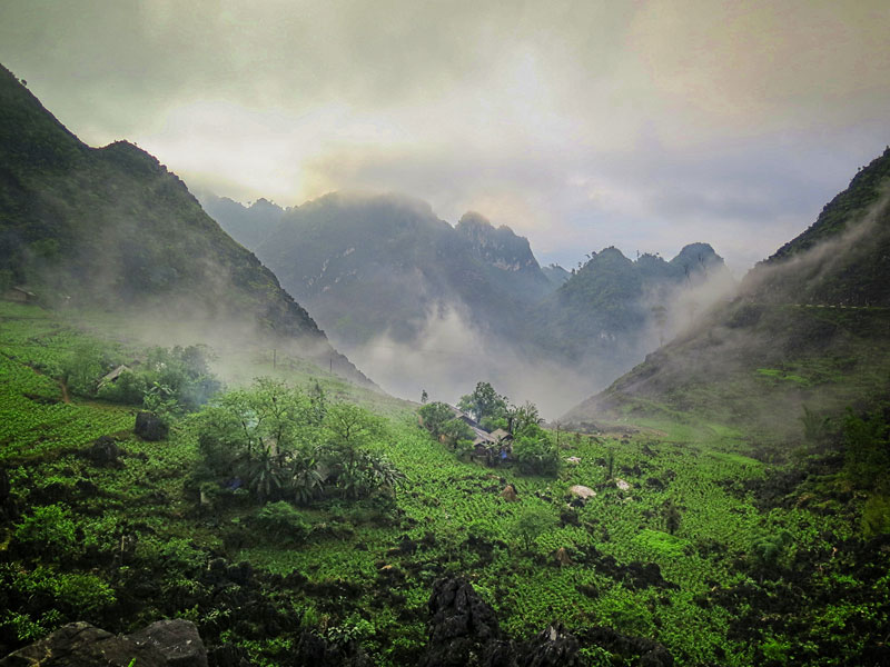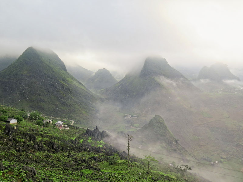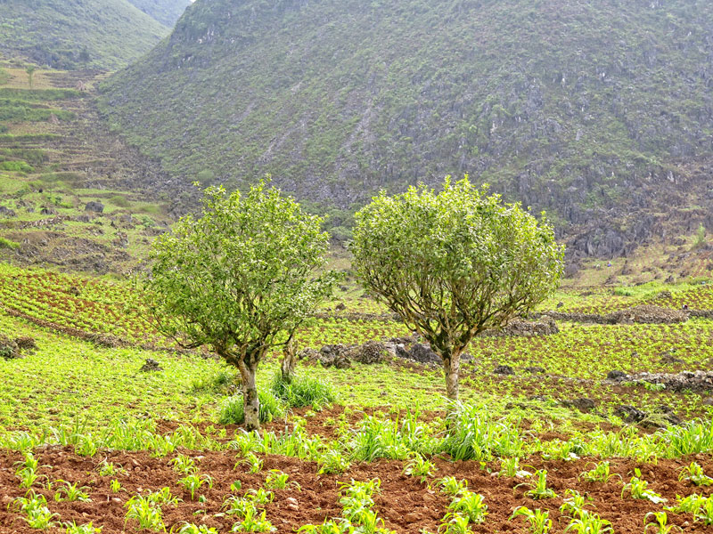 Qua vài nguồn thông tin, tôi biết có vài hộ làm trà có thể ghé thăm khá hứa hẹn. Đầu tháng 09/2013 là năm đầu tiên tôi khảo sát khu vực cao nguyên đá này sau hành trình dài 2 tuần trên chiếc xe Ford gầm cao. Từ Hà Giang rẽ theo QL4C qua Quản Bạ, Yên Minh dần chạm tới Đồng Văn. Ngồi trong xe ô tô, tôi cảm giác rõ rệt sự thay đổi độ cao dần qua những làn quanh co uốn lượn bo theo triền núi đá nhọn hoắt chổng thẳng trời xanh. Chỉ thấy đá và đá liên tiếp nối nhau lớp này chạy lớp kia, làn trước đan làn sau xen kẽ, ngoảnh lại sau lưng hay hướng nhìn phía trước vẫn là đá. Chúng tôi dừng xe vài lần mở rộng tầm mắt muôn trùng núi non. Cảm giác thật vĩ đại như bay lên thả bập bềnh, sóng sánh từ chóp đỉnh này qua đính chóp khác, giăng mắc trập trùng tựa như sóng biển đập mãi không ngừng. Đáng ngưỡng mộ những con người nhỏ bé khi sinh tồn và lao động vất vả trong điều kiện khắc nghiệt này qua nhiều thế hệ.