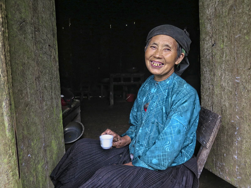 Cuối cùng tới nơi, cả 6 người chúng tôi như một đội, ai cũng hớn hở, vui vẻ theo nỗi niềm riêng mỗi người. Từ chỗ để xe, cuốc bộ một đoạn ngắn là vào nhà cụ làm chè nằm san sát trong quần thể khoảng 3-4 ngôi nhà cách nhau vài bước chân, hình như anh em ruột thịt sống hòa thuận kế bên nhau. Vào cửa, rảo bước đón chúng tôi là vợ ông cụ, mời chúng tôi ngồi quanh bếp lửa đang cháy tanh tách từ từ đưa chuyện. Ngôi nhà quá đôi đơn sơ, cũ tối, chật chội là nơi 2 vợ chồng già sinh sống, cô con gái duy nhất gả chồng khá xa. Có 2 gian buồng nhỏ đủ kê chiếc giường bé xíu, góc bếp một chiếc chạn nhỏ đựng bát đĩa nồi xoong, sang bên kia đối diện là gác cất ngô sấy khô. Không TV, không một vật dụng từ thế giới hiện đại trong ngôi nhà này. Xung quanh nhà có khá nhiều gốc trà cổ thụ thuộc về đại gia đình, cùng sinh sống, hái trà sao sấy. Suốt nhiều năm, tiếng lành đồn xa nhiều người biết đến trà ông già mù sao ngon vô cùng, ban đầu cán bộ xã uống thích đem tặng cán bộ huyện, lan dần lên tỉnh. Hồi ấy 10-20 năm trước, giao thông đi lại khó khăn vô cùng, 100km xa nhau lắm rồi tưởng muốn chia tay luôn, vậy mà nhiều người mê trà ngon vị hương đặc biệt khác lạ của cụ phải quyết tâm vượt đèo lội suốt, rừng núi hiểm trở để lấy dăm ba cân trà, đâu hẳn dễ dàng. Tôi tự cảm thấy niềm vui lạ, lòng đầy khấp khởi, như mình sắp bước vào hang báu, sắp có điều gì tốt đẹp xảy ra. Ông cụ đã già, đôi mắt kém dần mù hẳn nhưng đôi bàn tay tinh nhạy cảm nhận rõ ngọn lửa bập bùng lớn nhỏ, tai nghe tiếng chè va thành bom lao xao khô dần. Từng chi tiết, từng câu chuyện của bà cụ cùng 3 chàng trai Mông cứ tự tuôn ra một cách tự nhiên, góp nhau ngẫu hứng, chân thật từ cái họ thấy kể về đời sống, lao động, lịch sử gia đình, sự khốn khó cũng như niềm vui bao năm qua cho đến công cuộc làm trà rất đáng tự hào một cách khiêm nhường. Tiếc nhất là ông cụ bị ốm, lâu lâu phát ra tiếng ho khụ khụ từ trong buồng nhỏ, nên chúng tôi không được gặp ông trực tiếp, đành chờ dịp khác.